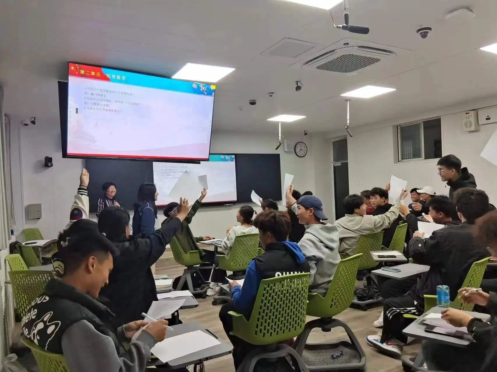 四个单元之间层层递进,逐步引导,单元的各个互动式团体活动紧紧贴合班会爱党爱国主题,形式多样,既有英雄人物猜谜、知识抢答又有红歌合唱、集体手绘,学生参与度高,反响热烈。