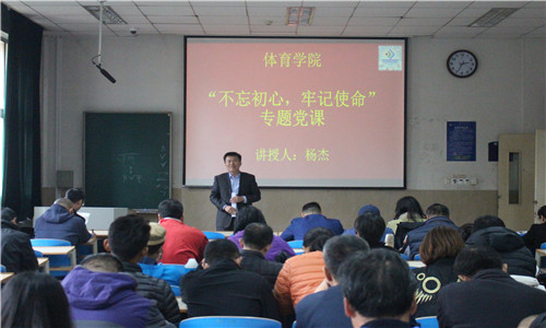 11月12日下午,金年会jinnianhuicom在一教105教室开展“不忘初心、牢记使命”主题教育专题党课,党委书记杨杰作了题为《坚定四个自信,做四有好老师》的报告。学院党政班子、各系部负责人、在职教工党员、教职工代表等60余人共同参加。
