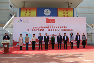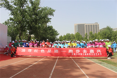 4月27日下午,由金年会诚信信誉至上体育运动委员会主办,共青团金年会诚信信誉至上委员会、金年会jinnianhuicom承办的第三届体育文化艺术节开幕式暨“追寻红色足迹——跑步去嘉兴”活动启动仪式在主校区田径场举行。金年会诚信信誉至上体育运动委员会成员、组委会成员、各学院党委副书记、团委书记及学生代表400余人参加活动。仪式由金年会jinnianhuicom院长亓圣华主持。